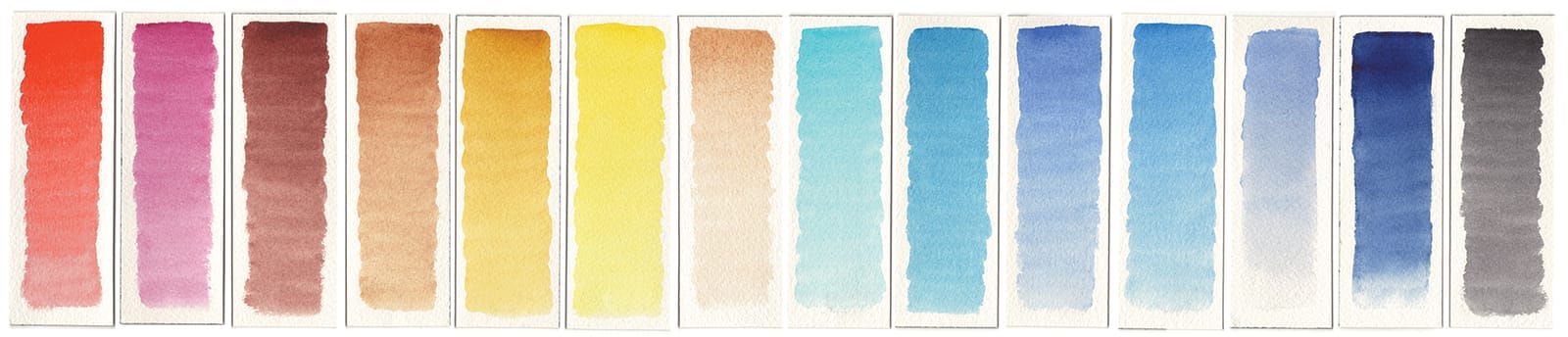I work between three main sets of watercolor paints: my Field Palette, which goes virtually everywhere I go, my 365 Skies Palette, which is tailored around the colors I use most when painting skies (all colors are listed below), and my "Tiny but Mighty" mini palette, which is my palette of choice for when I venture out for a long walk-jog.