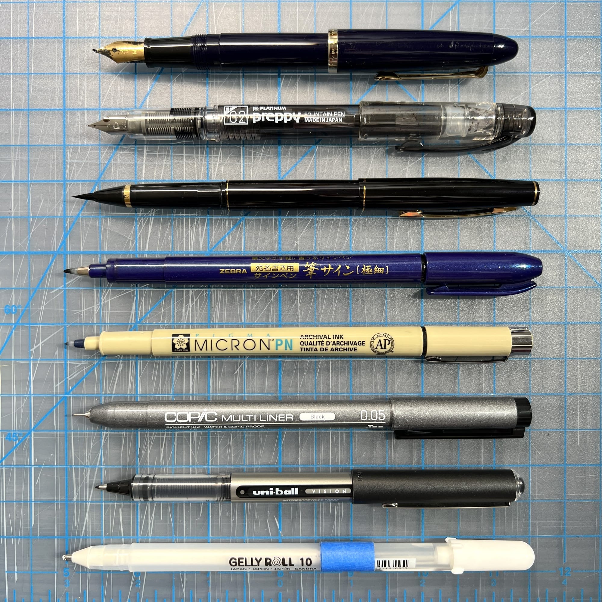 - I like to have a fine liner in my kit and prefer Copic Multiliners (pen #6) over Micron Pens as their caps re-post more securely than Microns and they have a less-pronounced ridge near the tip, which is more comfortable on my fingers.