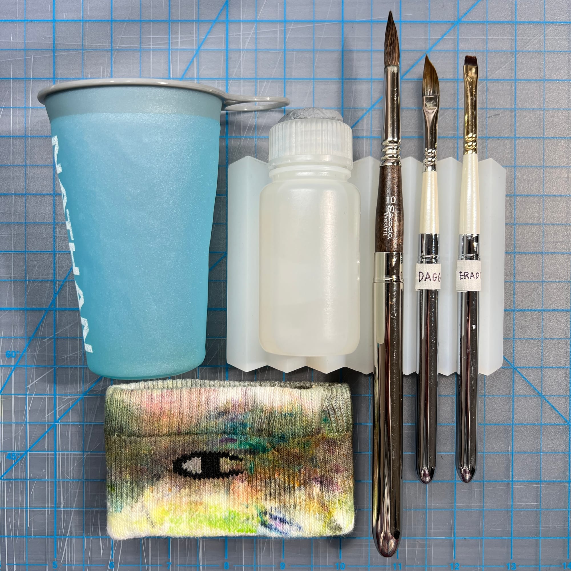 My set-up for my regular brushes and water management solution for painting in the field. Notice how I've nested the Nalgene bottle in the Nathan Running Cup to prevent water from sloshing in my bag.