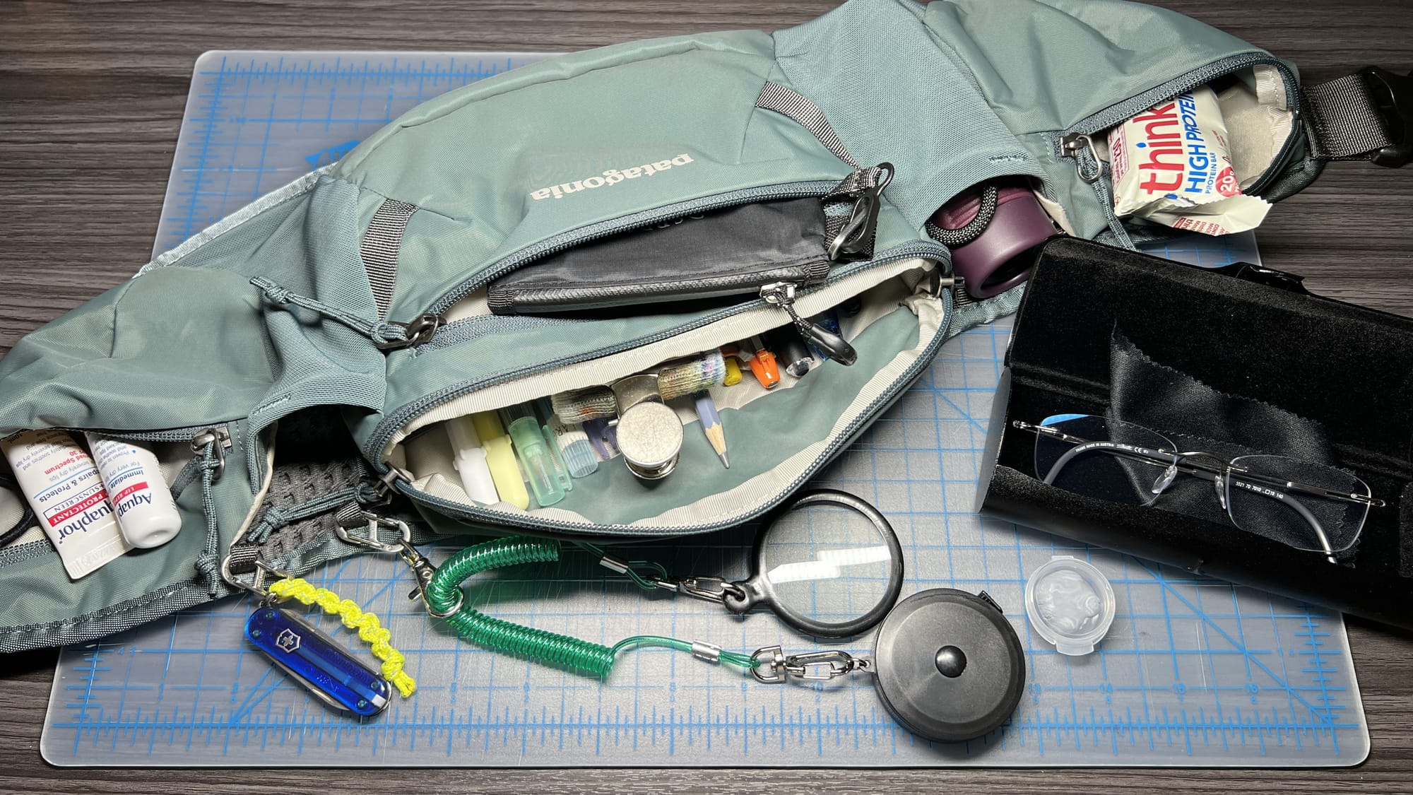 When I venture out for an extended hiking and nature journaling excursion where I will also be carrying a backpack, I wear this hip pack by Patagonia.
