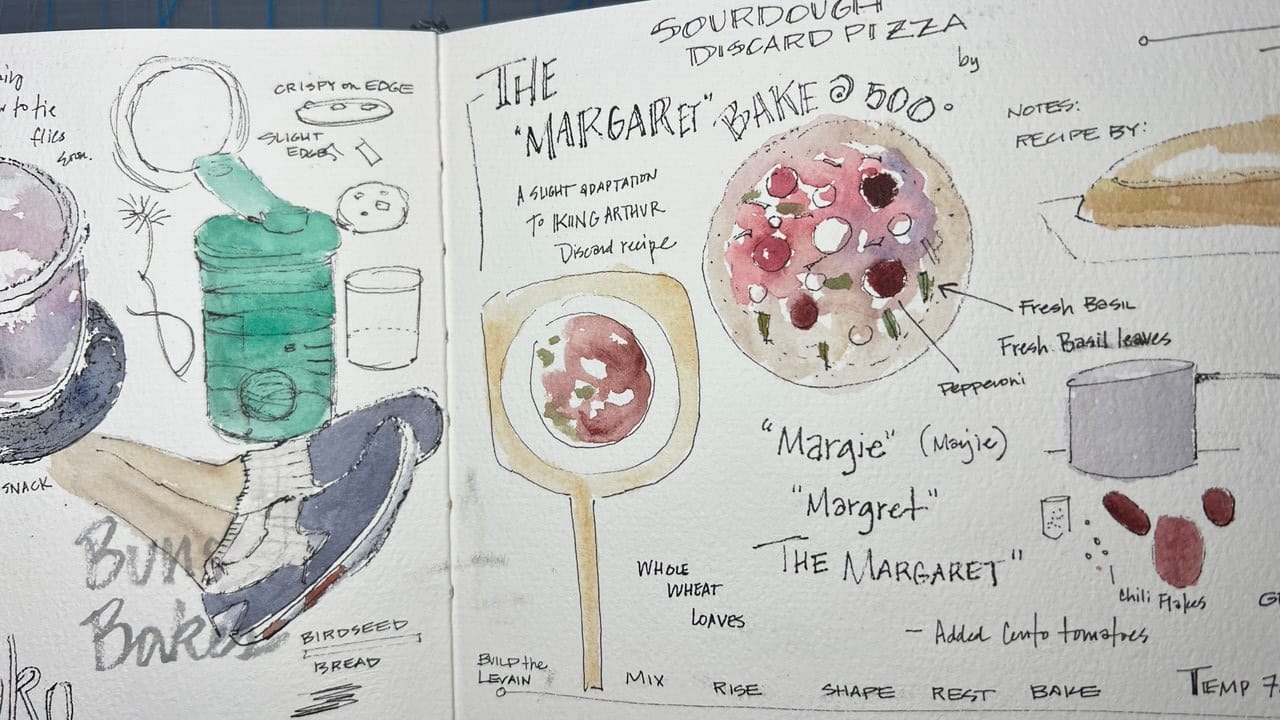 Do you have a special journal for pancakes? Notes to yourself? Little messy blobs, chicken scratches, and doodles? My pancakes journals are the only place where I go out of sequence. I'll flip through the pages, find a vacant corner, and scribble in something new next to a sketch I might have added two months prior. They're an utter mess. I throw most of them away. They're not meant to be shown. They're not meant to be anything but the vibe I'm feeling in that moment. They're my conduit of getting some of the substance of my head and my heart out through my hands.