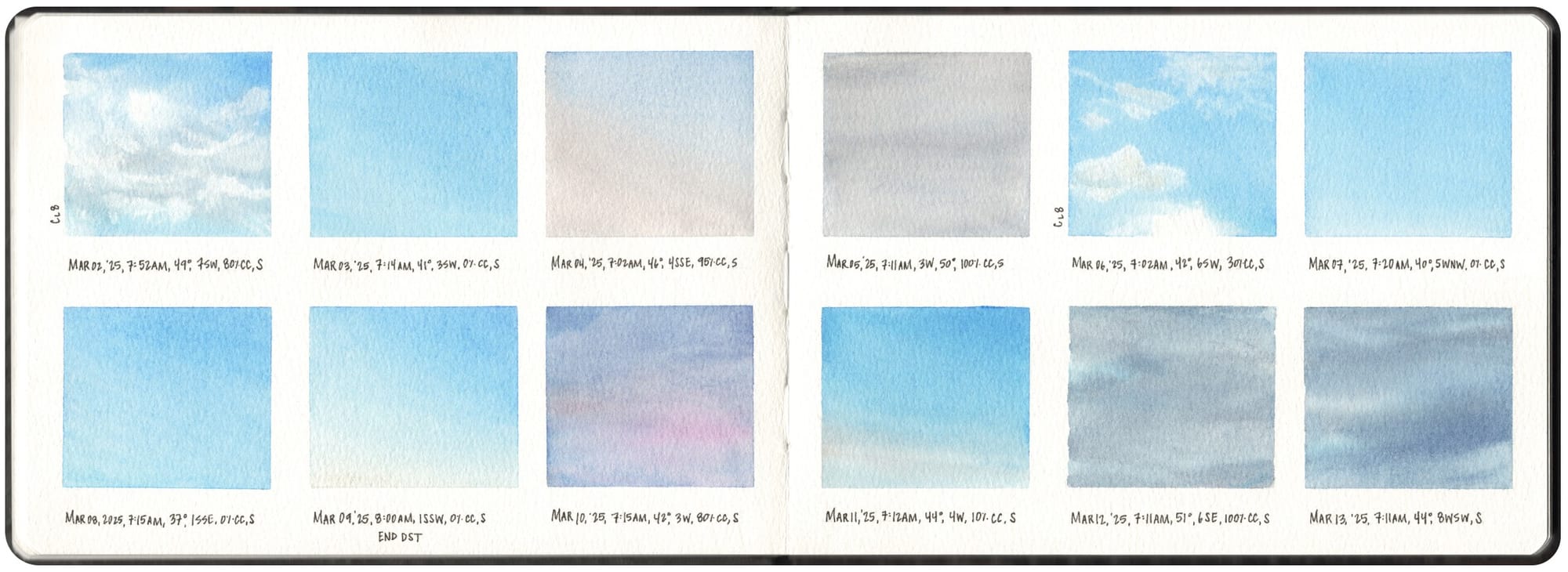 Watercolor windowscapes for March 2 through 13, 2025 | Year 3 of my 365 Skies project