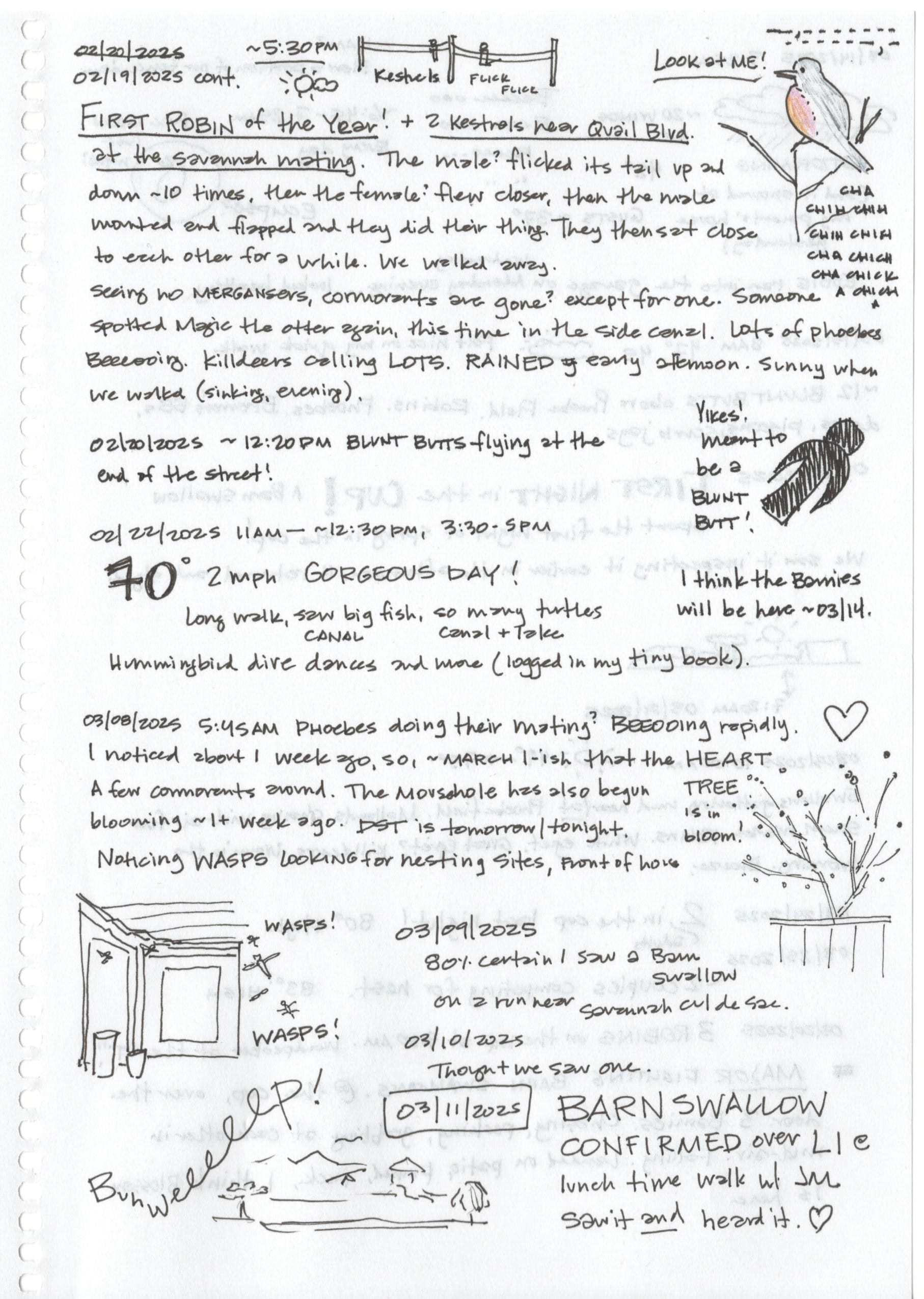 This is year four of tracking Barn Swallows and I was thrilled to see them return to our area within one day of my prediction based on past records. (Prior to consulting my spreadsheet where I track additional Barn Swallow migration and egg data, I thought it would be 03/14.) In addition to nature journaling, I keep a simple "Neighborhood Nature" log where I log birds, blooms, bugs, and more on a near-daily basis. It's simple and quick, brimming with what looks like chicken scratch, but chock full of some of the most meaningful data I've consistently recorded about what's happening just outside our door.