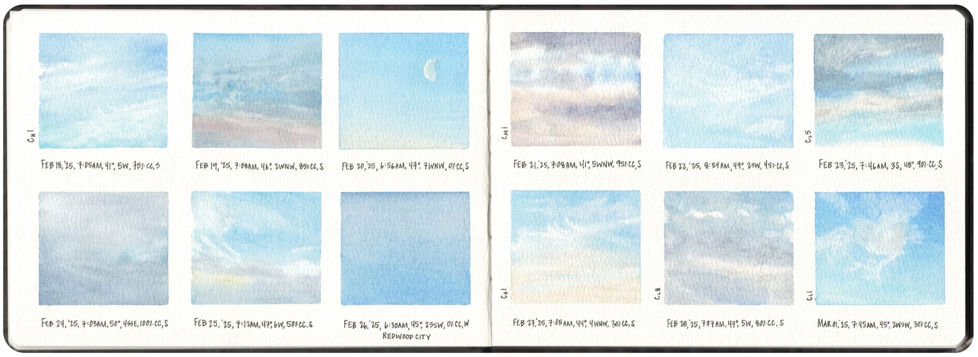 Another option is painting windowscapes. When it's too cold to linger outside, the sky becomes an ever-changing subject you can watch from indoors. Note the weather data alongside a small sky study for some helpful context.